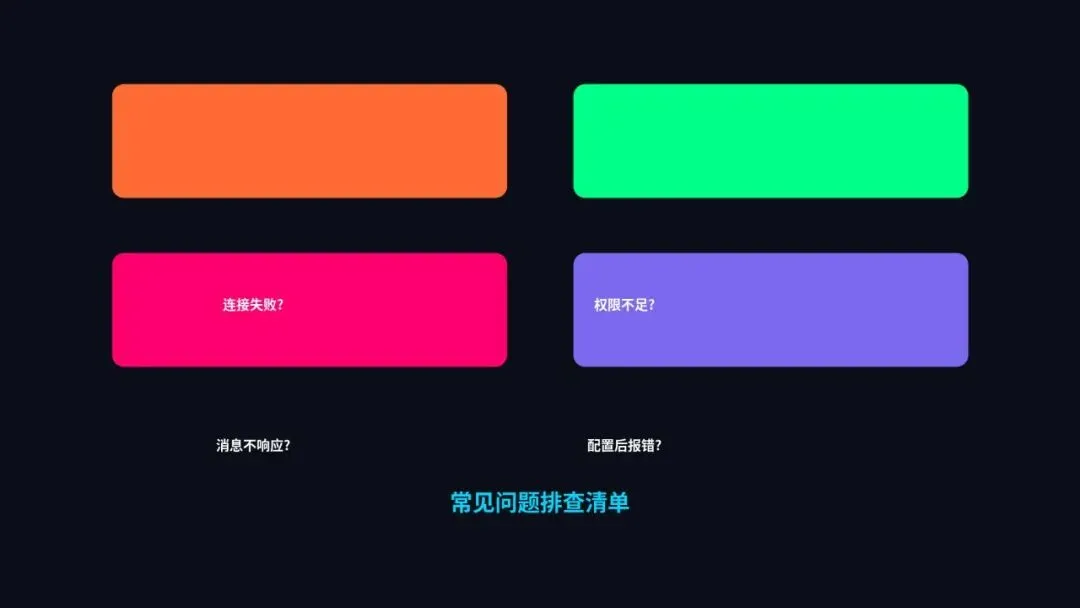 "App Secret错误"就是Secret填错了。"权限不足"就是权限没开通或没审批。"回调地址不可达"就是网络或防火墙的问题。