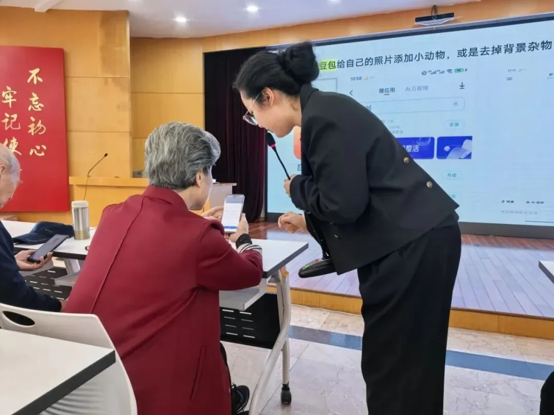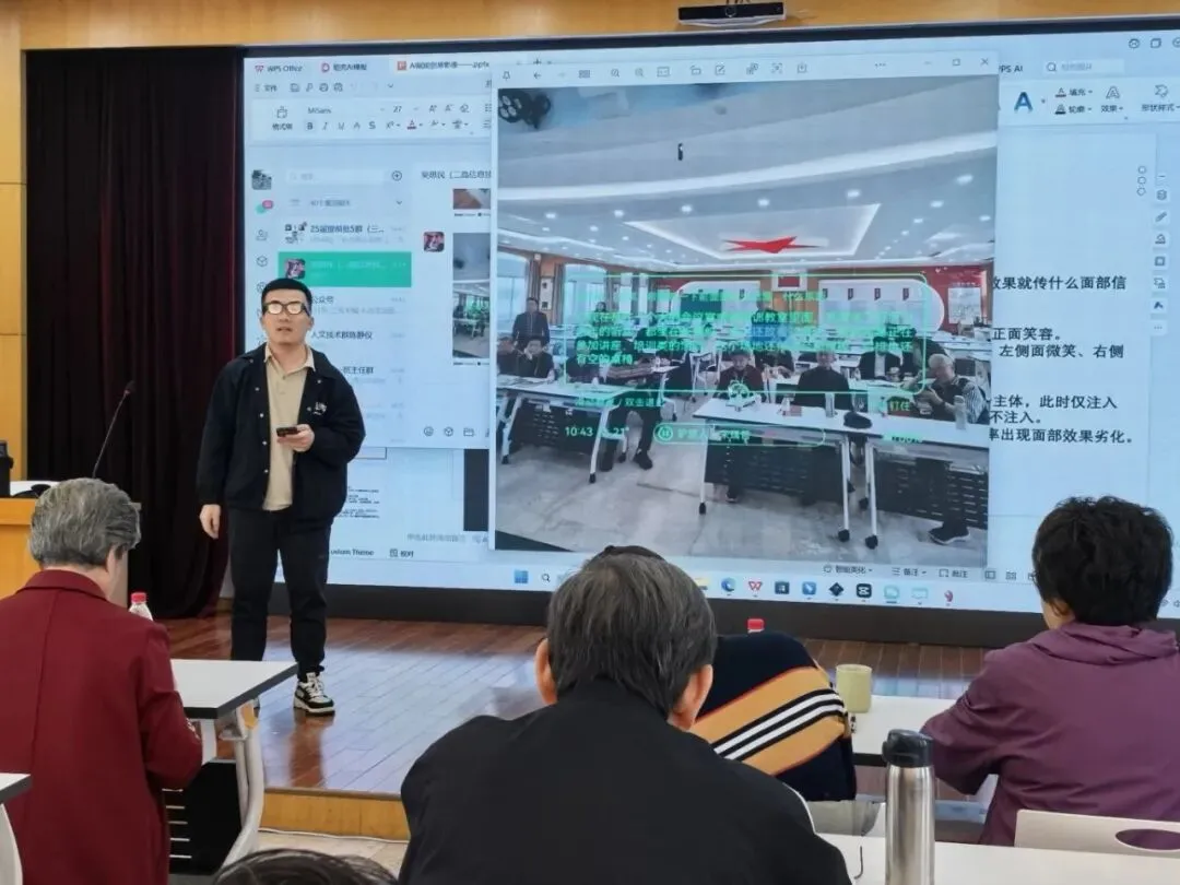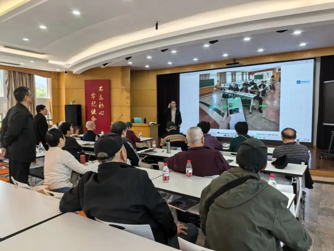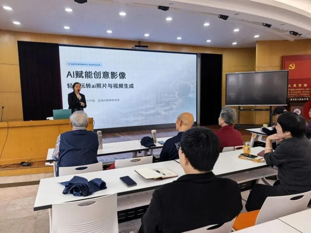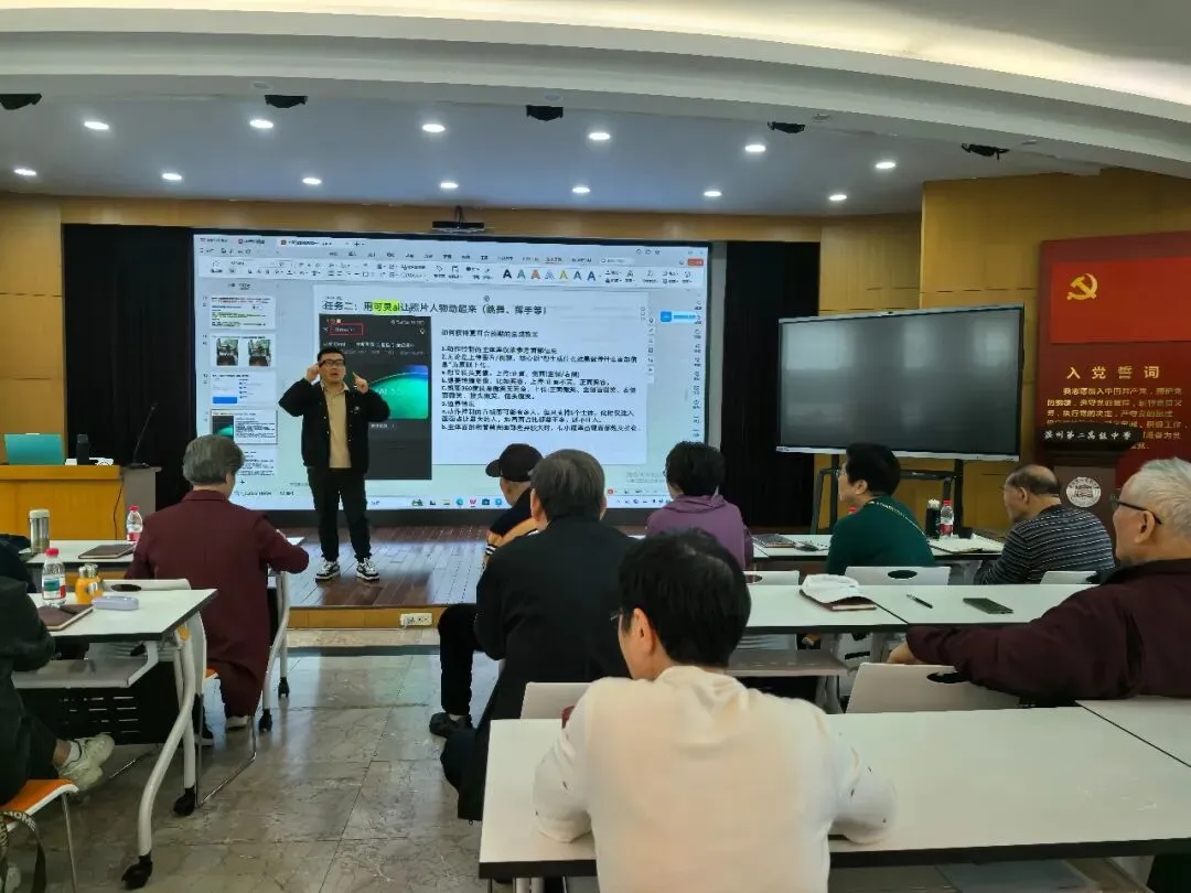 随后,陈茗熙老师带来了一场题为《AI赋能创意影像》的精彩讲座。从智能修图到AI生成艺术,前沿科技的魅力让老教师们目不转睛。更令人感动的是,我校信息老师吴思民、林怡梦全程陪伴在侧,手把手地教老教师们操作AI软件。吴思民老师还兴致勃勃地分享了AI眼镜的神奇功能——语音拍照、实时翻译、场景识别,引得老教师们跃跃欲试,现场笑语不断。科技的温度,在这一刻悄然流淌。