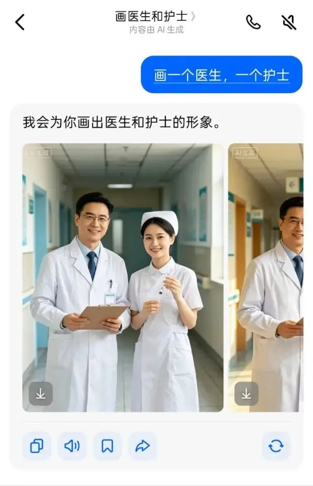 “画一个医生,一个护士”,AI自己脑补了"医生=男的,护士=女的"。