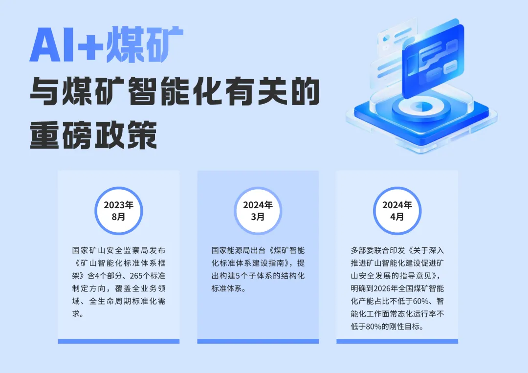 在数字中国建设纵深推进背景下,国家锚定“新质生产力”培育,围绕煤矿智能化密集出台多轮重磅政策,搭建全方位政策支持体系和标准框架,为AI+煤矿发展定调指路。