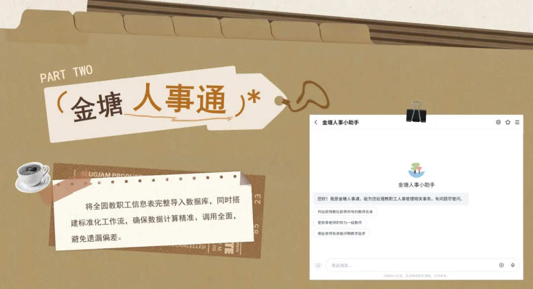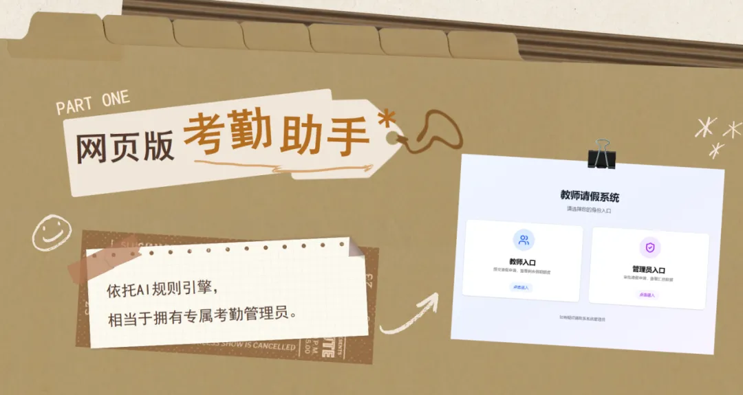 将AI技术融入日常管理,打造两款实用化人事管理智能体。“考勤网页”实现教师自助考勤、AI自动校验审批,告别纸质核对繁琐流程;“人事通”对话助手,人事信息一键查询统计,快速获取教师年龄、荣誉资质等关键信息,数据调用全面无遗漏。让AI技术有效解放人力,为校园管理工作提供全新思路与高效路径。