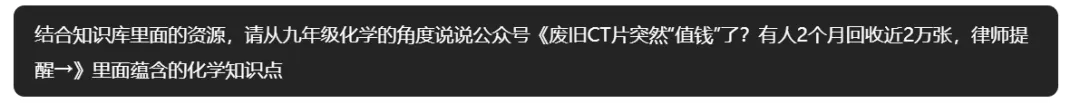 先将人民日报公众号原文添加到中学化学专属知识库中,再让 AI梳理出核心知识点,具体可以在在知识知识库中这样提问: