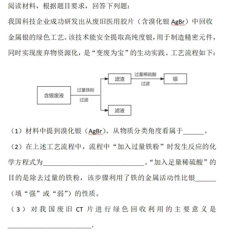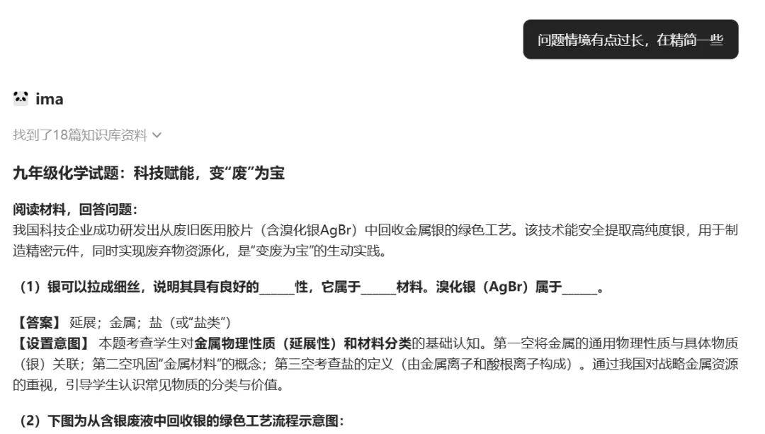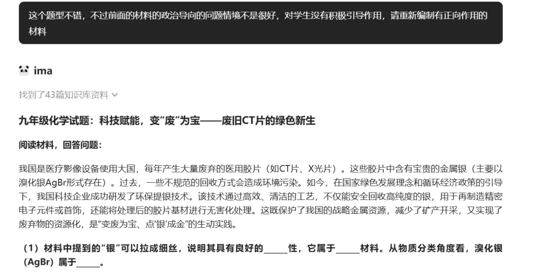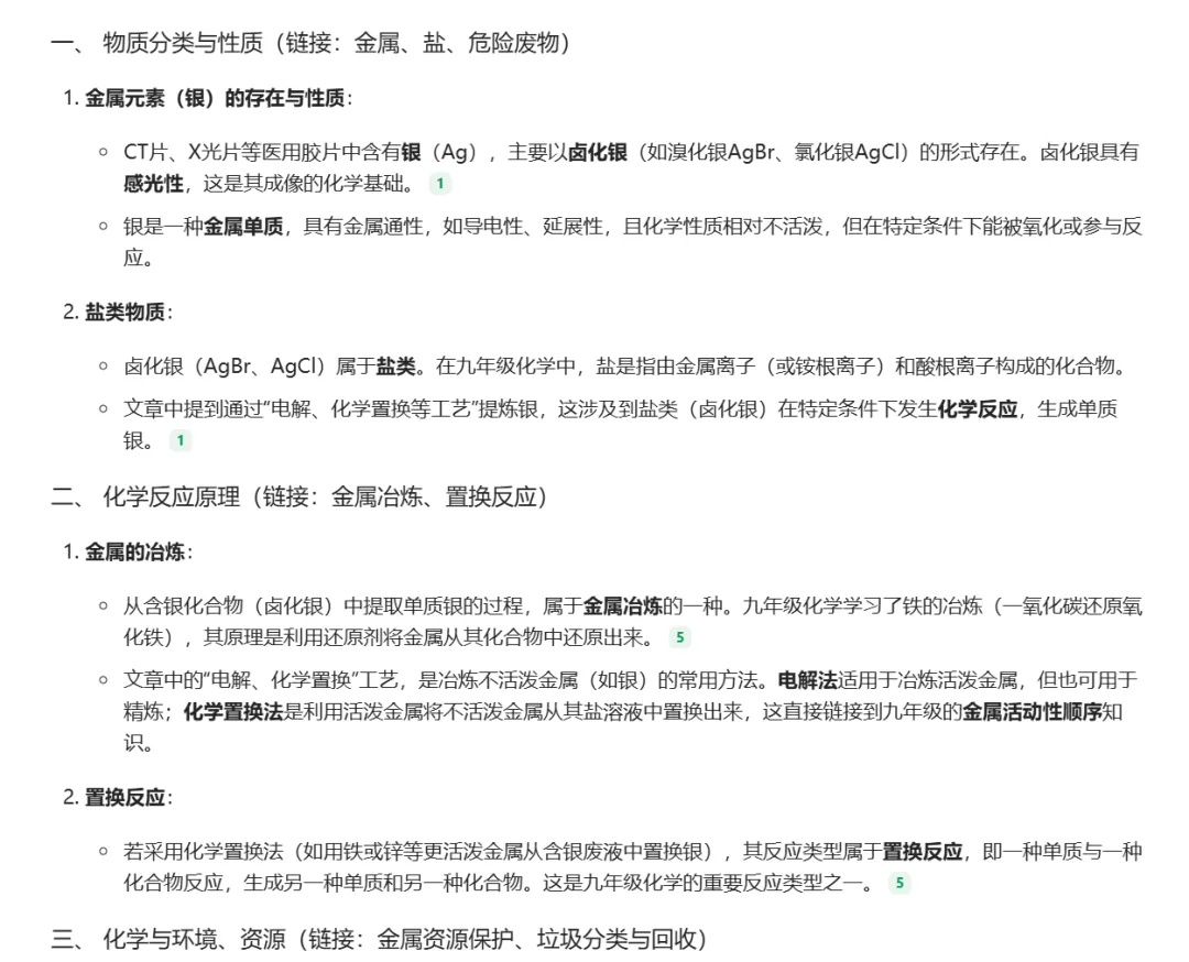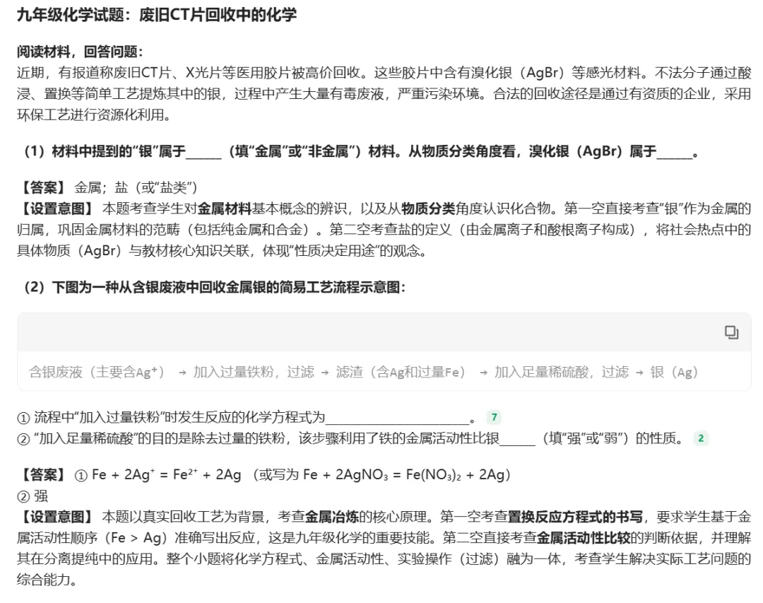 在人民日报《废旧CT片突然“值钱”了?有人2个月回收近2万张,律师提醒→》一文中,废旧医用胶片回收提银成为社会热点。这一素材完美对接九年级化学第八单元——金属资源的利用与保护,于是我依托 AI 知识库,完成了一道化学试题的全流程创作。