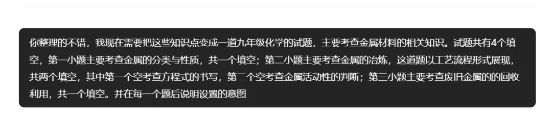 上面生成的试题基本上已经满足我们的日常需求,但是题目的情境还是有点长,这时可以继续借助AI对题目进行精简润色,压缩情境材料,让试题更贴合试卷排版。再次进行了提问,结果如下:
