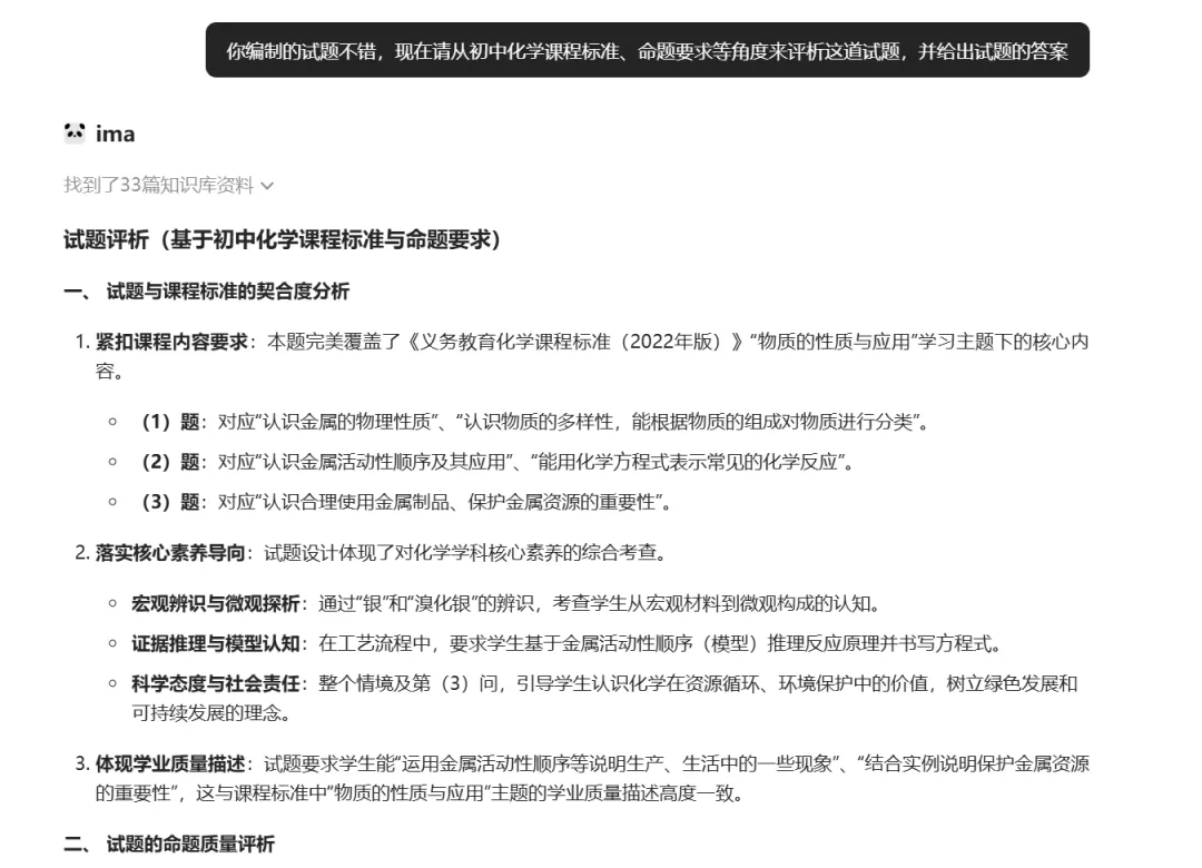 当习题编制完成后,如果老师们对试题与课程标准、试题的质量以及试题的答案及评分标准不是很清晰,可以继续对知识库进行提问,这时知识库就像一位学科高级顾问,能从新课标角度,对试题进行专业评析,明确素养考查点、学业质量对标,让命题更规范、更专业。