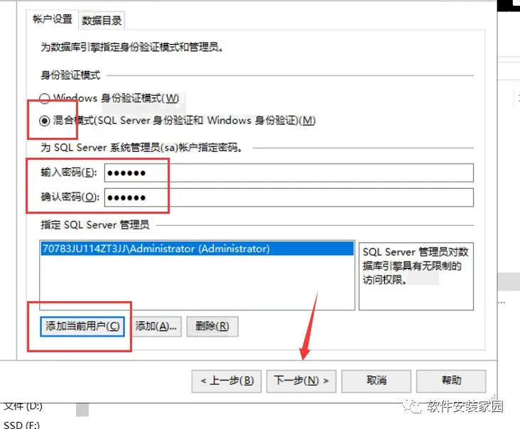 第十六步:选混合模式 输入密码 密码自己记住 添加当前用户 下一步