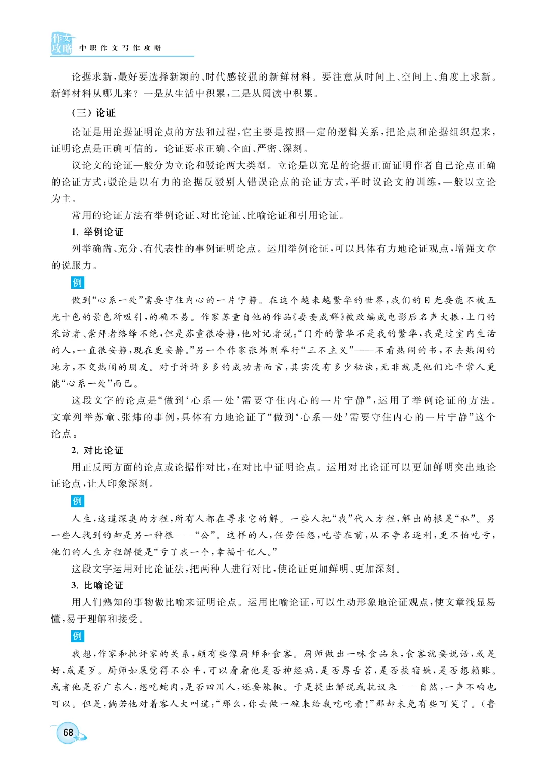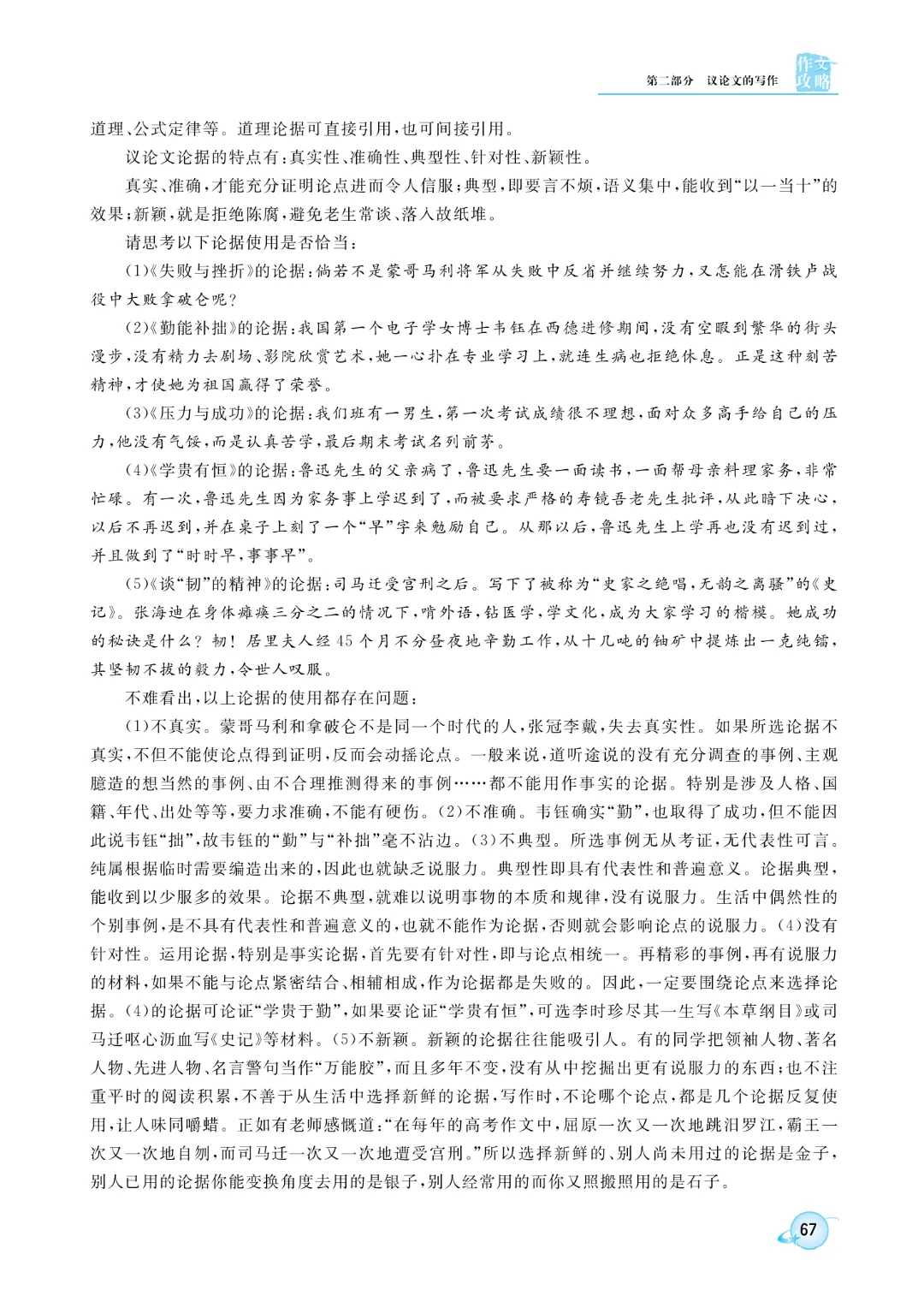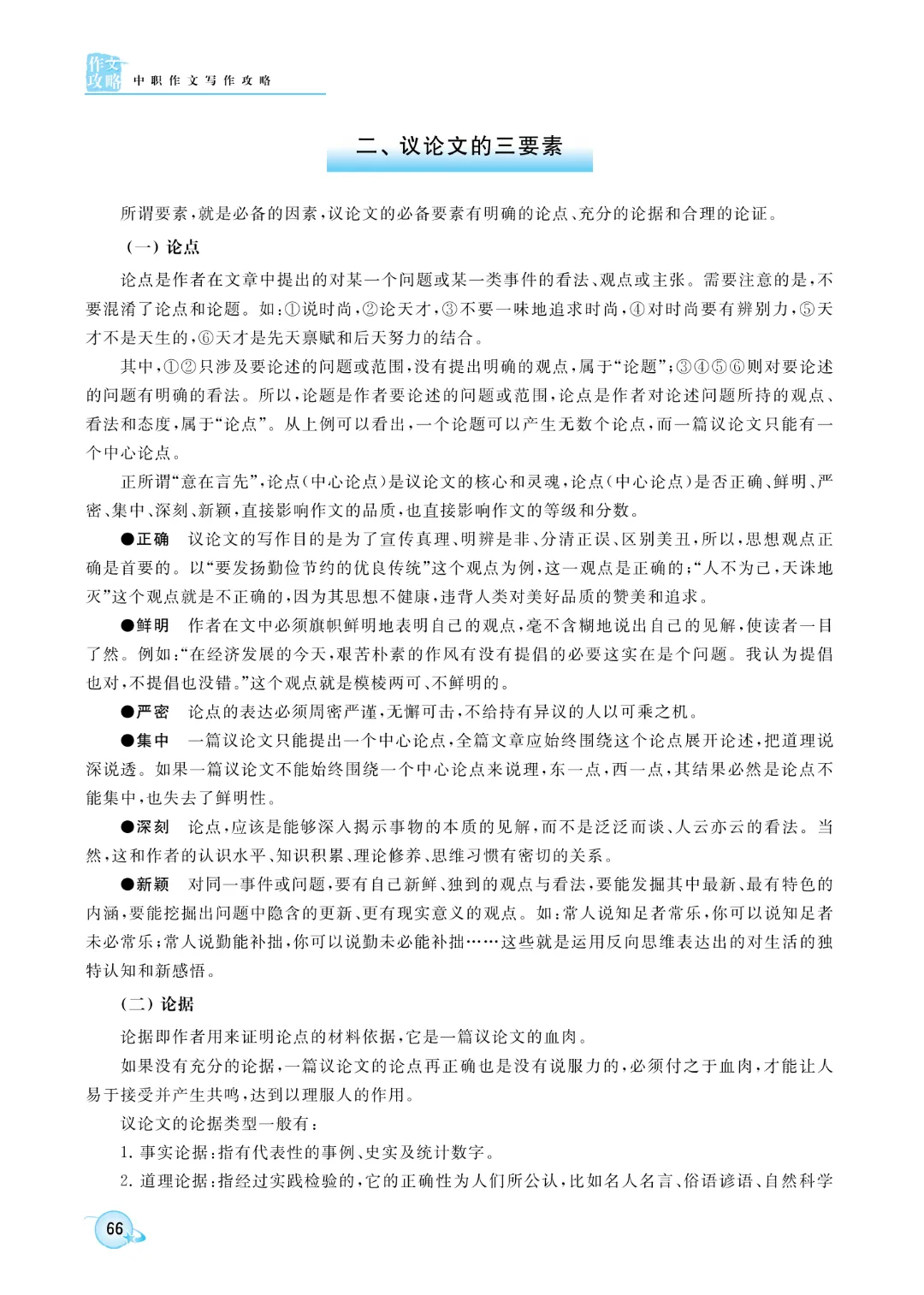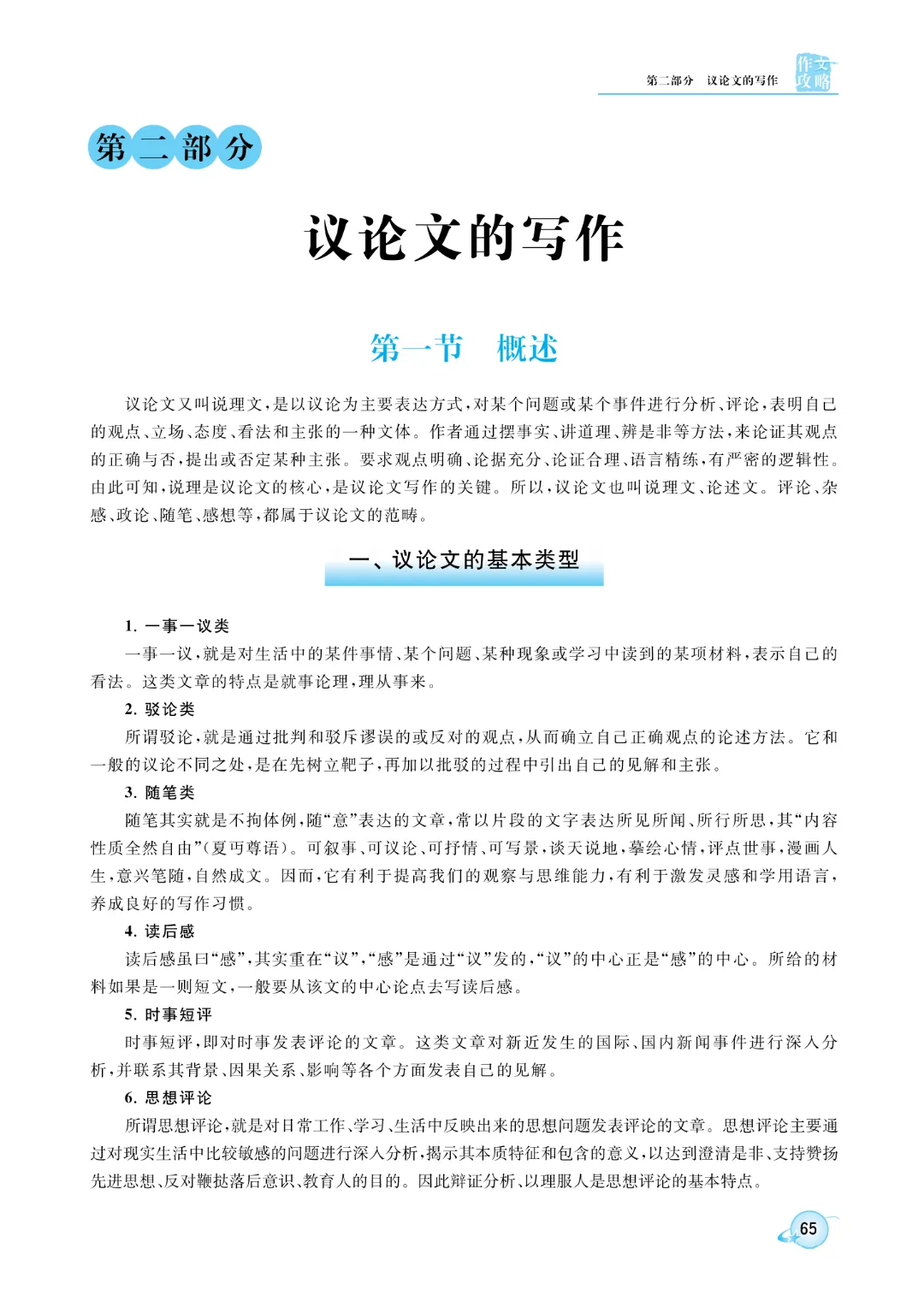 “议论文写作”模块,主要从作文的审题、立意,文体的结构、选材,语言的组织、表达等方面进行具体而全面的讲解。