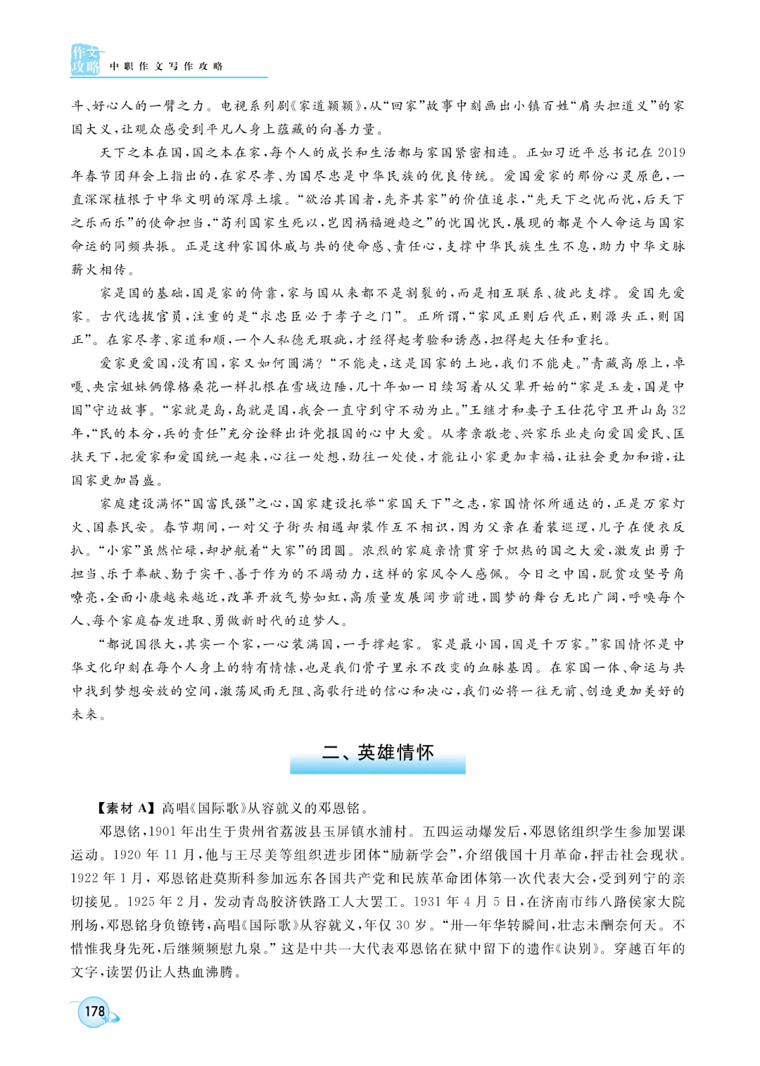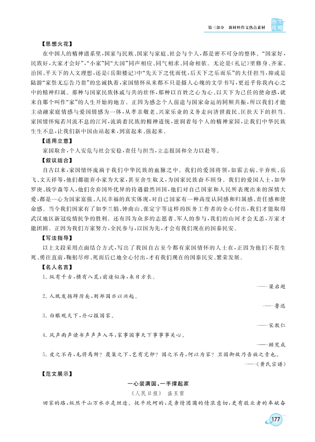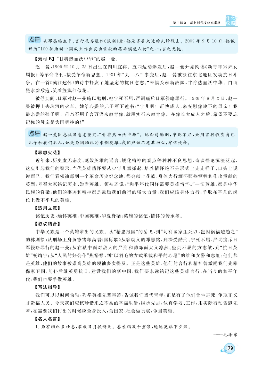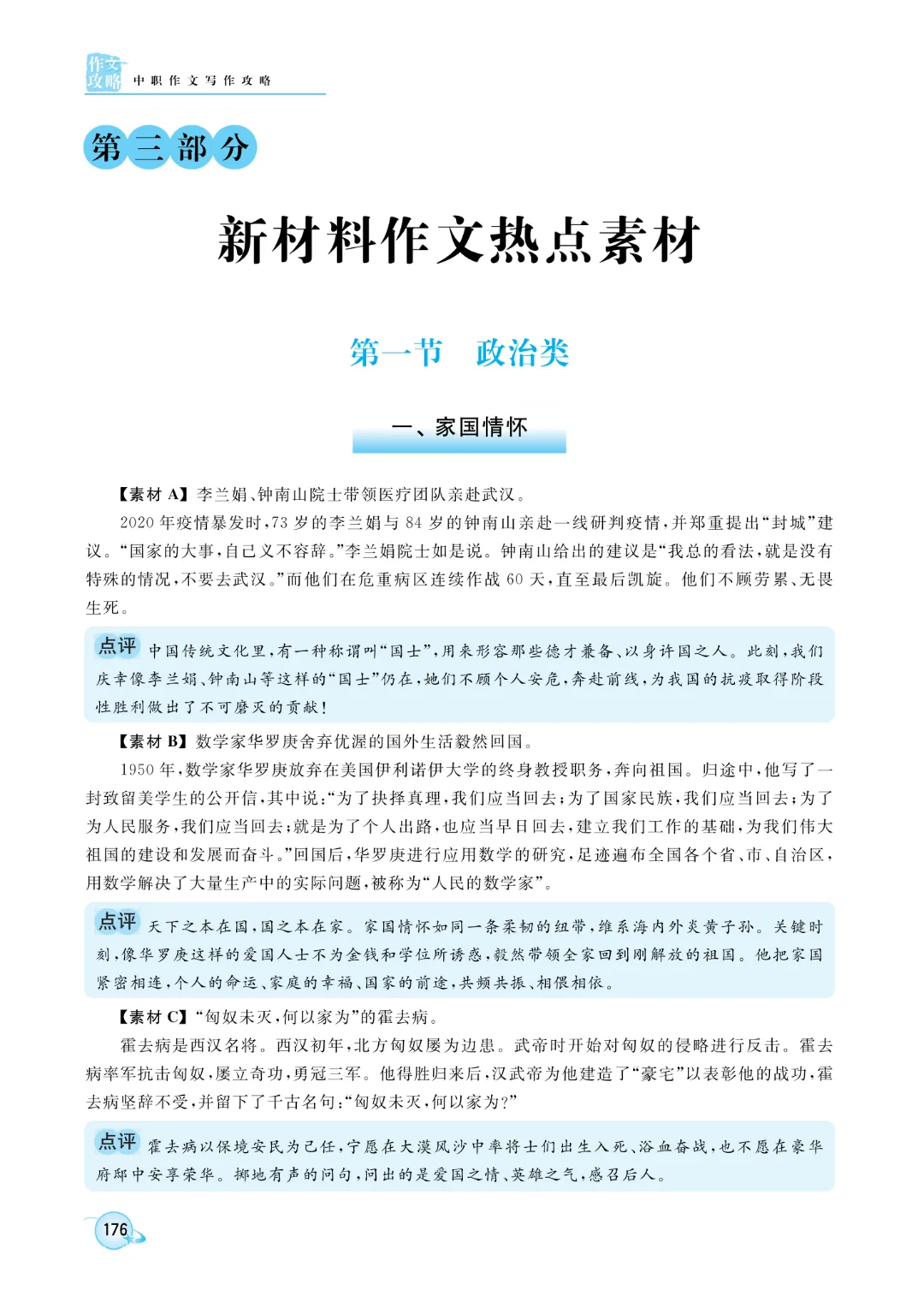 “热点素材”模块,从政治、经济、文化、科技、教育、体育等六大领域,列举当今热点话题,有典型的事例素材和经典的名言名句,力求帮助学生关注现实生活,学以致用。