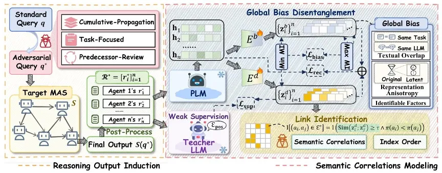 在三大约束的引导下,攻击者构造对抗查询q*与目标MAS进行交互,得到系统输出S(q*),该输出已完整包含所有中间智能体与决策智能体的推理输出。由于S(q*)是无结构的文本内容,需要通过后处理步骤,将其整理为结构化的智能体推理输出列表,用于后续的语义关联建模。