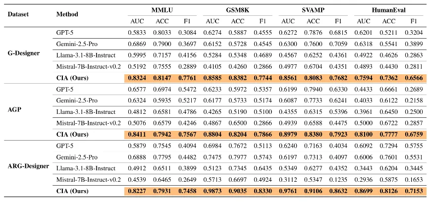 大量严谨的实验结果表明,CIA在三类主流生成式优化拓扑框架、四大任务数据集上,实现了平均0.87的AUC,峰值AUC高达0.99,性能显著超越GPT-5、Gemini-2.5-Pro等所有主流LLM基线,充分证实了MAS通信拓扑在黑盒场景下存在严重的隐私泄露风险。