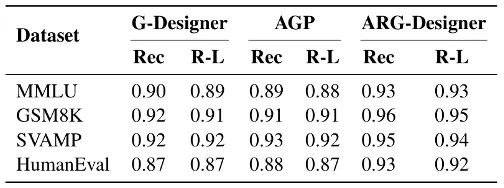 从结果可以看出,本文的对抗查询策略在所有场景下均实现了极强的输出恢复效果,召回率普遍超过0.90,ROUGE-L普遍超过0.87;在拓扑更简单的ARG-Designer场景下,恢复效果更优,GSM8K数据集上的召回率达到0.96,ROUGE-L达到0.95。