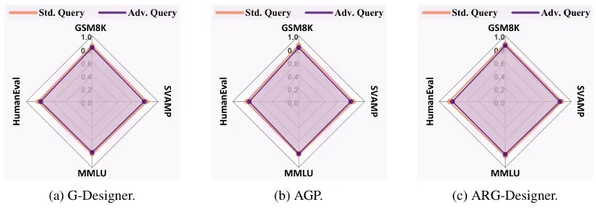 该图对比了G-Designer、AGP、ARG-Designer三类拓扑框架,在4个数据集上,标准查询与对抗查询的任务准确率,二者几乎完全重合,无显著差异。