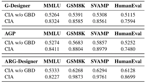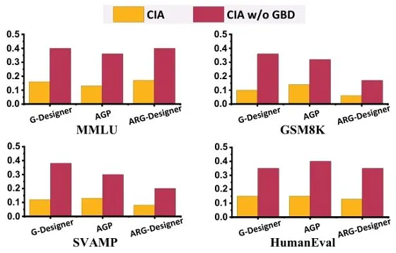 例如,在ARG-Designer框架的GSM8K数据集上,完整CIA的AUC为0.9873,而移除GBD后仅为0.6268;在AGP框架的SVAMP数据集上,完整CIA的AUC为0.8979,而移除GBD后仅为0.5857。