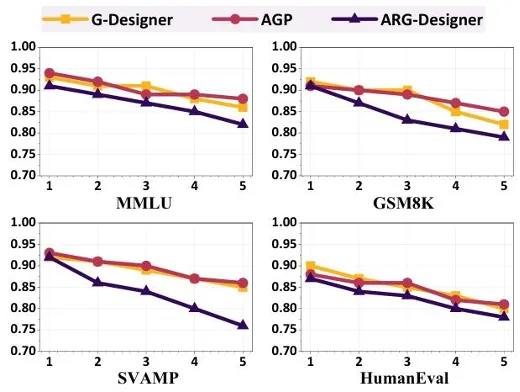 其次越简单的通信拓扑,越容易被精准推断,泄露风险越高。如表2所示,ARG-Designer为GSM8K和SVAMP数据集构建的MAS,平均节点数仅为3左右,平均边数仅为3.1左右,显著少于其他场景;而CIA在这两个场景下的AUC分别达到0.9873和0.9761,接近1.0。