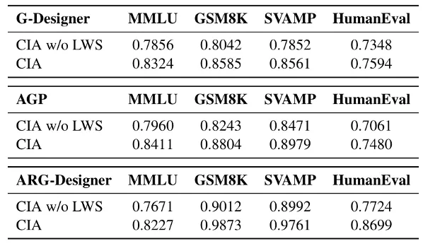 从消融实验结果可以看出,移除LWS模块后,所有场景下的AUC均出现明显下降。例如,在ARG-Designer框架的GSM8K数据集上,完整CIA的AUC为0.9873,而移除LWS后仅为0.9012;在AGP框架的SVAMP数据集上,完整CIA的AUC为0.8979,而移除LWS后仅为0.8471。