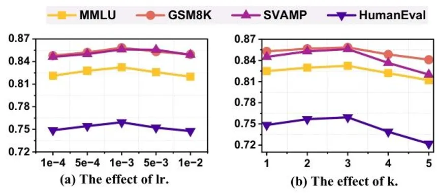 本文通过网格搜索,对两个核心超参数进行了调优分析,分别是学习率lr与LWS中的top-k值,实验结果如图6所示。