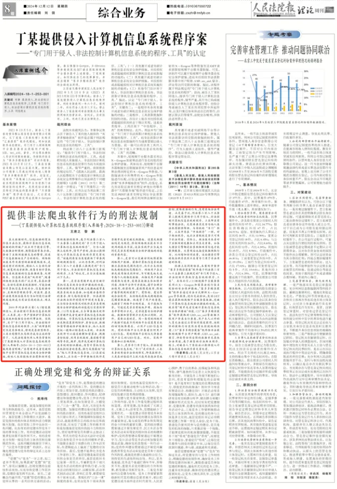 入库参考案例解读:提供非法爬虫软件行为的刑法规制——《丁某提供侵入计算机信息系统程序案(入库编号:2024-18-1-253-001)》解读在大数据时代,信息数据的商业价值日益凸显,获取计算机信息系统数据的软件被广泛应用于搜索引擎、大数据分析预测、舆情监控等各方面,推动了互联网数据生态的繁荣,促进了信息数据向生产力的转化。网络爬虫技术作为典型的数据获取技术,是通过特定的规则,模拟人工自动化访问、浏览网站并抓取、收集目标计算机信息系统数据的信息数据收集、处理技术。信息技术是把“双刃剑”,随着网络爬虫技术的广泛应用,其在批量化、自动化获取系统数据时,可能会破坏计算机信息系统安全、信息数据安全、互联网管理秩序等,对滥用、甚至非法使用爬虫技术行为如何进行法律规制逐渐成为司法实践的热点、难点问题。2009年刑法修正案(七)增设提供侵入、非法控制计算机信息系统程序、工具罪,进一步严密保护计算机信息系统和数据安全的刑事法网。实践中,关于“专门用于侵入、非法控制计算机信息系统的程序、工具”的审查判定仍是实务难点,特别是在新型程序、工具日趋替代木马程序成为主流的背景下。人民法院案例库入库参考案例《丁某提供侵入计算机信息系统程序案(入库编号:2024-18-1-253-001)》裁判要旨明确:“具有避开或者突破网络平台等计算机信息系统安全保护措施,使他人未经授权非法获取访问受限的数据的软件,属于刑法第二百八十五条第三款规定的‘专门用于侵入计算机信息系统的程序’。行为人提供上述软件,情节严重的,依法以提供侵入计算机信息系统程序罪定罪处罚。”该裁判要旨为类案提供了审查判断的规则指引。以此为参照,对刑法第二百八十五条第三款规定的“专门用于侵入、非法控制计算机信息系统的程序、工具”的认定,应当注意把握以下几点:第一,是否具有避开或者突破计算机信息系统安全保护措施的功能。传统的避开或者突破上述措施通常表现在系统安全层面,如逃避杀毒程序的查杀、防火墙的控制等。但在提供非法爬虫软件的情形中则更为复杂,应当结合具体情况对软件是否具有规避安全防护措施的功能进行实质性审查。(1)作为基础,应当审查相关软件是否避开或者突破计算机信息系统验证措施。计算机信息系统控制者通常会采取设置密码防护、身份认证、数据加密等措施保护数据安全,他人未经授权一般难以轻易进入系统。非法爬虫软件可以通过破解加密算法、规避身份校验、利用系统漏洞、盗窃账号密码等手段,避开、绕开或突破计算机信息系统的验证措施,违背计算机信息系统控制者的意愿,强行或隐蔽地“侵入”他人计算机信息系统。(2)在前述基础上,应当进一步审查相关软件是否避开或者突破反爬措施。设置反爬措施均是为规范、限制网络爬虫技术不当使用的技术手段,这在实践中应当成为判定是否具有规避安全防护措施的功能的重要内容。第二,是否可以突破访问权限获取网络用户数据。获取计算机信息系统数据应在授权范围内进行,而不应未经授权或超越授权范围进行。网络用户在注册或使用相关软件时,不可避免地生成专属个人的相关数据。而相关用户数据的获取与使用,需要在数据主体知情并同意、网络平台许可并授权,遵守合理合法使用、保密使用、最低限度使用、限制扩散等规则的前提下,有限制、有边界地合法使用。未经相关授权或超越授权范围获取数据,既违背了用户的意愿,也损害了网络平台的利益。关于授权与否,可通过是否具有版权声明、授权白名单等明示方式,是否设置安全防护措施、数据加密等默示方式加以判断。此外,需要注意的是,同一类型的网络用户数据可能在不同网络平台设置有差别的访问权限要求。以用户UID信息为例,有的网络平台允许查看任何用户UID信息,有的网络平台则仅允许查看用户自己的UID信息,对此,实践中需要加以准确判断。第三,是否专门用于侵入、非法控制计算机信息系统。“专门”是对程序、工具本身的用途非法性的限定,即某款程序、工具在功能设计上就只能用来违法实施控制、获取数据的行为,没有其他合法用途。正是基于此,刑法第二百八十五条第三款规定提供专门用于侵入、非法控制计算机信息系统的程序、工具即具有刑事违法性,无需再查实是否为他人违法犯罪提供帮助。与传统的“专门”程序、工具中存在“中性程序”一样,对于爬虫程序,也应注重甄别是否只可用于非法用途。实际上,爬虫技术本身对于互联网的发展和应用至关重要,如各大搜索引擎都是依靠爬取网页信息才能提供服务,大量网站也接受数据爬取行为,从而增加访问流量,这些搜索引擎的爬虫程序显然不具有专门用于非法用途的性质。依据上述判断标准,本案例中案涉“客多多精准获客”软件属于刑法第二百八十五条第三款规定的“专门用于侵入、非法控制计算机信息系统的程序、工具”。具体而言:(1)短视频平台服务器采用以X-Gorgon加密算法进行签名校验的安全保护措施,“客多多精准获客”软件系通过非法方式解析X-Gorgon等参数值,进而完成验证,发送GET请求获取短视频平台服务器数据,突破了计算机信息系统验证措施的功能,无疑具有“避开或者突破计算机信息系统安全保护措施”功能。(2)“客多多精准获客”软件