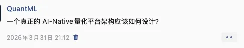 最近几个月,一直在重度开发Quant Agent平台,架构多次推倒重建,初版终于基本完成。在3月31号的时候发了一条pyq