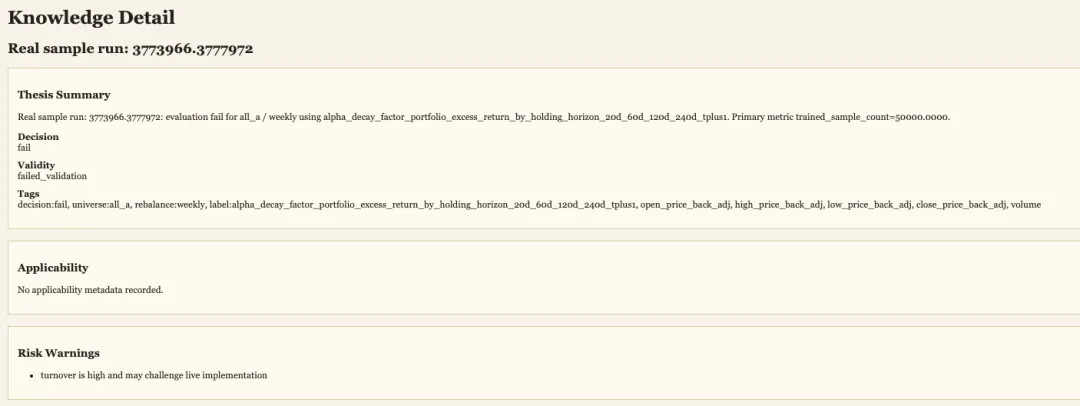 下一次 Agent 再看到类似假设时,应该能提醒:这个方向之前做过,失败原因是换手过高;类似字段曾经有 PIT 风险,先做数据审计;这个策略在全 A 有效,但在大盘股池失效;上次不是假设失败,而是执行后端不支持某个诊断口径。