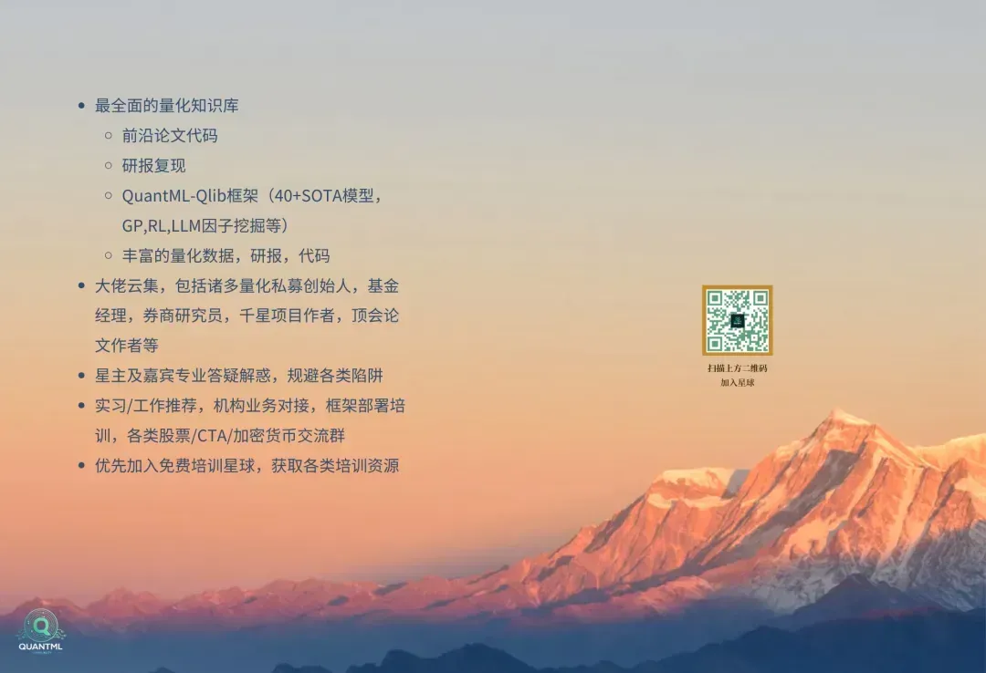 顶级圈层: 社区涵盖头部机构从业者、知名私募创始人、机构量化负责人,基金经理,券商金工分析师、GitHub千星作者及顶会学者构成。 每日高价值内容: 持续分享前沿论文、论文研报复现、模型代码、核心Alpha因子以及QuantML-Qlib框架等。