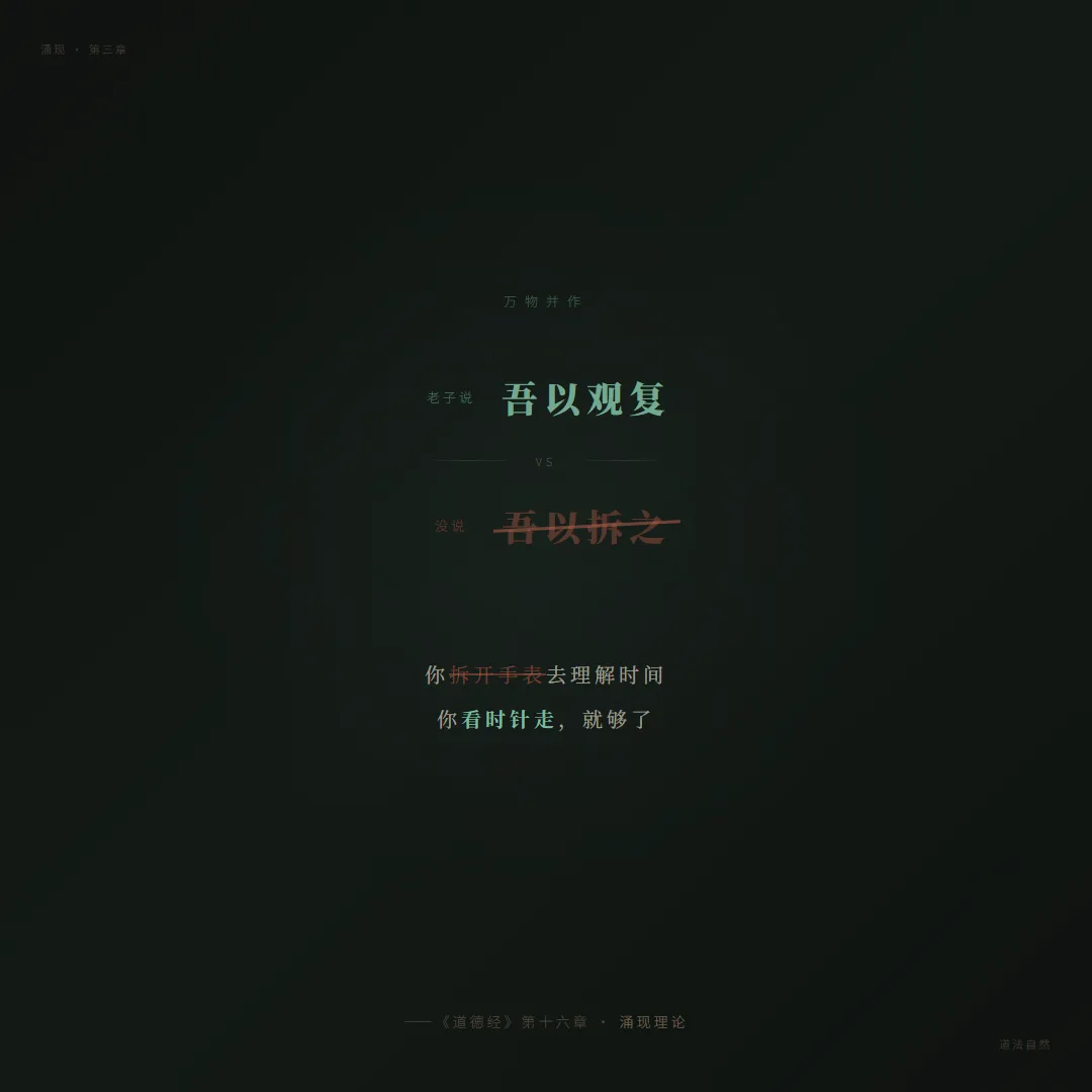"万物并作,吾以观复。"——老子没说"万物并作,吾以拆之"。他说的是观。看它怎么长,看它怎么变,看它自己会往哪走。