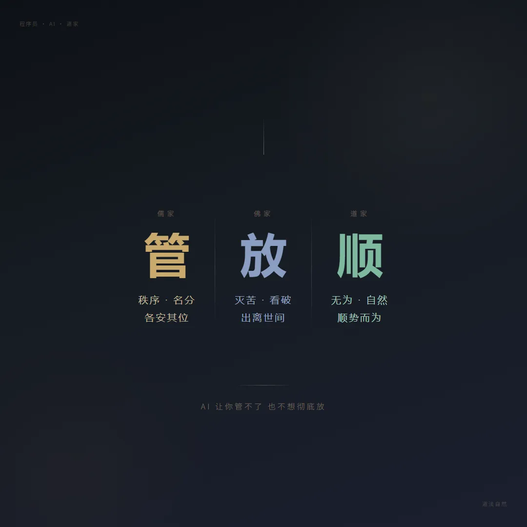 我认识一个做了十二年后端的人。去年开始用 Copilot,然后是 Claude,然后自己搭 Agent。上个月他发了条朋友圈,只有四个字:道法自然。