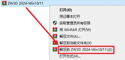 1.右键下载的压缩包,选择【解压到“ZW3D 2024-Win10/11”】。
