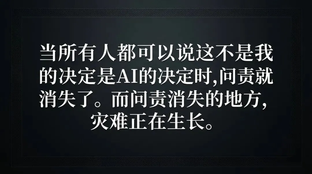 当所有人都可以说"这不是我的决定,是 AI 的决定"时,问责就消失了。而问责消失的地方,灾难正在生长。