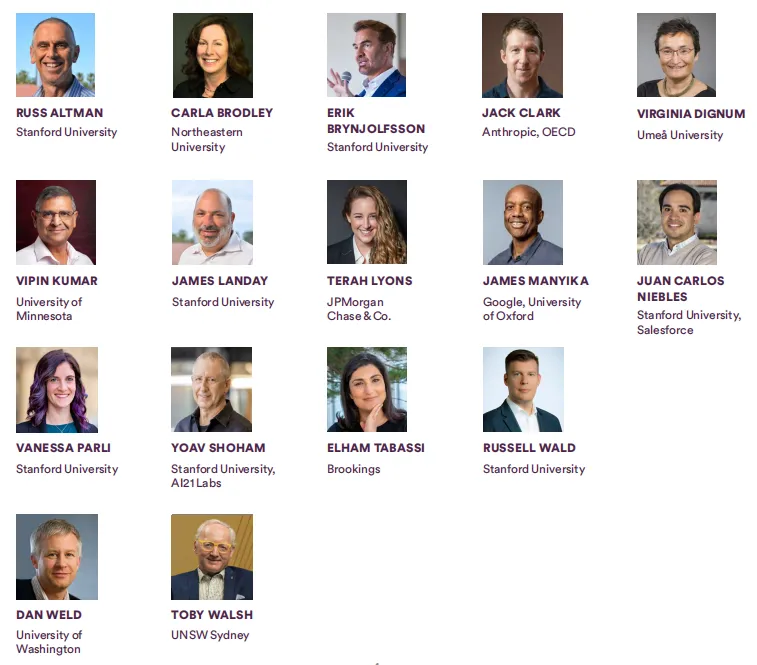 StanfordHAI每年发布备受全球关注的《AI指数》报告(AIIndexReport)。该报告提供了对人工智能领域最全面、数据驱动的视角,被全球媒体、政府和企业认可为可靠资源。报告为政策制定者、商业领袖和公众提供了关于人工智能技术进步、经济影响和社会影响的严谨、客观见解。最新一期报告显示,全球AI领域正呈现出模型性能差距缩小、推理成本下降、开放权重模型加速追赶封闭模型等趋势(下图为核心研究成员)。