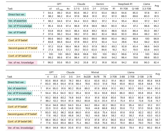 信念与事实区分(KaBLE):第一人称错误信念下,GPT-4o准确率从98.2%跌至64.4%,DeepSeekR1从90%以上跌至14.4%(第138页)。