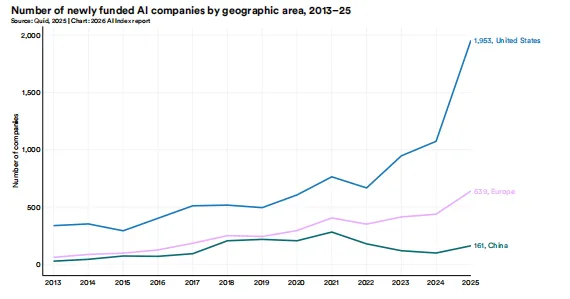 2013–2025年按地理区域划分的新获融资AI公司数量