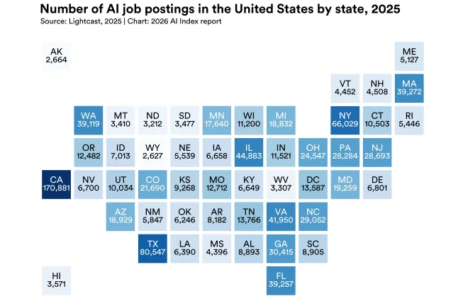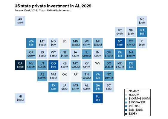 2025年美国各州AI投资数据,现有报告主要聚焦于全国总量及头部企业动向。根据《2026斯坦福AI指数报告》,2025年美国投资总额预计达2859亿美元,是中国同期124亿美元的23倍以上。