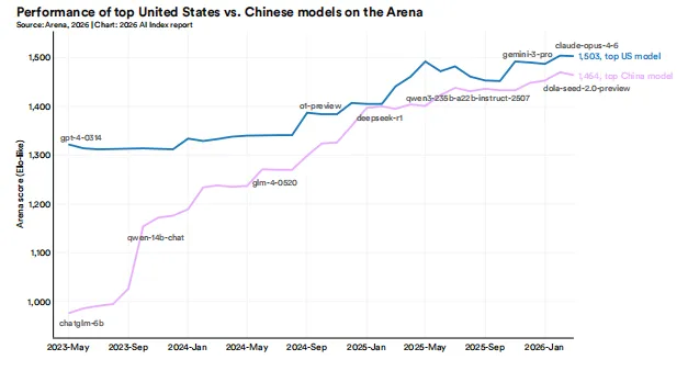性能差距基本消除:2025年2月DeepSeek-R1曾短暂追平美国顶尖模型;截至2026年3月,美国领先幅度仅2.7%(第88-89页)。