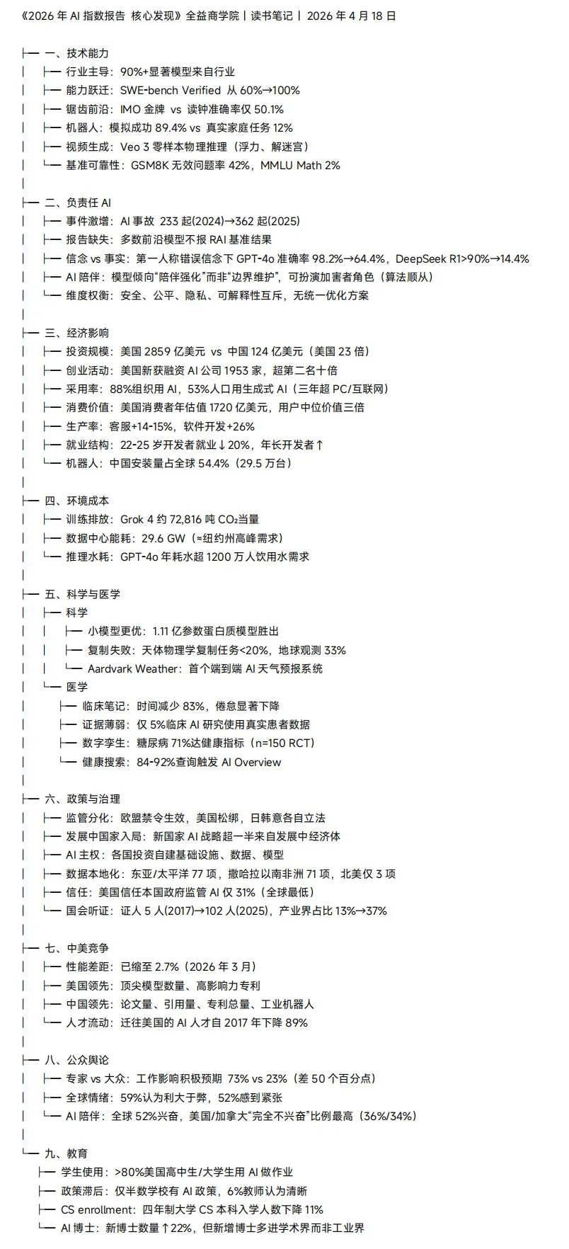 核心要点·Top Takeaways👇 1. AI能力没有平台期。它在加速,并以前所未有的规模触达更多人。 2025年,行业产出了超过90%的前沿显著模型,其中多个模型在博士级科学问题、多模态推理和竞赛数学等方面已达到或超过人类基线。在一个关键编码基准——SWE-bench Verified上,性能在一年内从60%跃升至接近100%的人类基线水平。组织采用率达到88%,五分之四的大学生现在使用生成式AI。 2. 中美AI模型性能差距已基本消失。 自2025年初以来,美国和中国模型多次交替领先。2025年2月,DeepSeek-R1曾短暂追平美国顶尖模型;截至2026年3月,Anthropic的顶尖模型仅领先2.7%。美国仍然产出更多顶级AI模型和更高影响力的专利,而中国在论文发表量、引用量、专利产出和工业机器人安装量上领先。韩国因其创新密度而脱颖而出,人均AI专利数位居世界第一。 3. 美国拥有最多的AI数据中心,其中绝大多数芯片由一家台湾代工厂制造。 美国拥有5,427个数据中心,是其他任何国家的十倍以上,其能源消耗也超过任何其他国家。台积电(TSMC)一家公司制造了几乎所有领先的AI芯片,使全球AI硬件供应链依赖于台湾的一家代工厂——尽管台积电在美国的扩张已于2025年开始运营。 4. AI模型可以在国际数学奥林匹克竞赛中赢得金牌,但无法可靠地读取时间——这是研究人员所称的“AI锯齿状前沿”的一个例子。 Gemini Deep Think在IMO上获得了金牌,但顶尖模型正确读取模拟时钟的时间仅为50.1%。AI代理在OSWorld(跨操作系统测试代理真实计算机任务的基准)上的任务成功率从12%跃升至约66%,尽管在结构化基准测试中它们仍然每三次尝试就失败约一次。 5. 机器人在受控环境中表现出色,但在大多数家务任务中仍然失败。 机器人仅在12%的家务任务中成功,这凸显了AI离掌握物理世界还有多远。在RLBench上,基于软件模拟的机器人操作成功率已达89.4%,但可预测的实验室环境与不可预测的家庭环境之间的差距仍然很大。 6. 负责任AI的发展未能跟上AI能力的步伐,安全基准滞后,事件急剧增加。 几乎所有领先的前沿AI模型开发者都报告了能力基准的结果,但负责任AI基准的报告仍然零星不齐。有记录的AI事件从2024年的233起上升到362起。更棘手的是,最近的研究发现,改善负责任AI的某一维度(如安全性)可能会损害另一维度(如准确性)。 7. 美国在AI投资方面领先,但其吸引全球人才的能力正在下降。 2025年美国私营部门AI投资达到2859亿美元,是中国的23倍以上(中国124亿美元)——尽管仅看私营投资数据可能低估了中国的AI总支出,因为中国设有政府引导基金。美国在创业活动方面也处于领先地位,2025年有1953家新获融资的AI公司,是第二名国家的十倍以上。然而,迁往美国的AI研究人员和开发者数量自2017年以来已下降89%,仅过去一年就下降了80%。 8. AI的普及速度达到历史水平,消费者从他们通常免费使用的工具中获得了可观的价值。 生成式AI在三年内达到了约53%的人口普及率,比个人电脑或互联网都快,尽管普及速度因国家而异,且与人均GDP密切相关。一些国家的普及率高于收入水平所预测的,例如新加坡(61%)和阿拉伯联合酋长国(54%),而美国以28.3%的普及率排名第24位。到2026年初,生成式AI工具对美国消费者的年估值达到1720亿美元,每位用户的中位价值在2025年至2026年间增长了三倍。 9. AI带来的生产率提升出现在许多入门级就业开始下降的同一领域。 研究表明,在客户支持和软件开发领域,生产率提升了14%至26%,而在需要更多判断力的任务中,效果较弱或为负。AI代理的部署在几乎所有业务职能中仍保持在个位数。在软件开发领域——AI带来的生产率提升最为明显——美国22至25岁的开发者就业人数自2024年以来下降了近20%,而年长开发者的就业人数仍在增长。 10. AI的环境足迹随着其能力的提升而扩大。 Grok 4的预估训练排放量达到72,816吨二氧化碳当量。AI数据中心的电力容量升至29.6吉瓦,与纽约州的高峰需求相当;仅GPT-4o的年推理耗水量就可能超过1200万人的饮用水需求。 11. 面向科学的AI模型可以超越人类科学家,但更大的模型并不总是表现更好。 前沿模型在ChemBench上平均优于人类化学家,然而在天体物理学的复制任务中得分低于20%,在地球观测问题上得分为33%。一个1.11亿参数的蛋白质语言模型MSAPairformer在ProteinGym基准上击败了此前领先的方法;一个2亿参数的基因组学模型GPN-Star表现优于一个比它大近200倍的模型。大多数面向科学的AI基础模型来自跨部门合作,这与通用AI领域行业主导的格局形成对比。 12. AI正在改变临床护理,但严格的证据仍然有限。 能够根据患者就诊自动生成临床笔记的AI工具在2025年得到了广泛采用。在多个医院系统中,医生报告称书写笔记的时间减少了高达83%,职业倦怠显著降低。然而,在某些工具之外,临床AI的证据基础仍然薄弱。对500多项临床AI研究的回顾发现,近半数依赖于考试式问题而非真实患者数据,只有5%使用了真实的临床数据。 13. 正规教育滞后于AI发展,但人们在人生的每个阶段都在学习AI技能。 超过80%的美国高中生和大学生现在使用AI完成与学校相关的任务,但只有半数的初中和高中制定了AI政策,只有6%的教师表示这些政策清晰明确。在课堂之外,阿联酋、智利和南非的AI工程技能增长最快。美国和加拿大的新AI博士数量在2022年至2024年间增加了22%,但这些新增的博士进入了学术界,而非工业界。