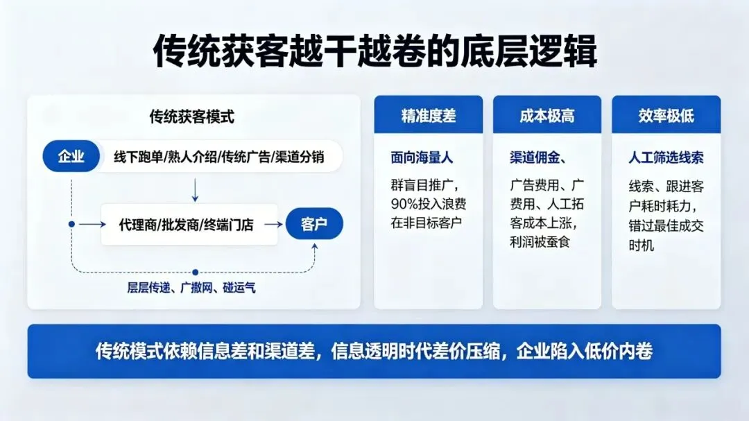 传统获客模式,本质是“层层传递、广撒网、碰运气”:企业依赖线下跑单、熟人介绍、传统广告、渠道分销,客户线索经过代理商、批发商、终端门店等多层过滤,真正到达企业时,要么意向度极低,要么被层层加价稀释利润。