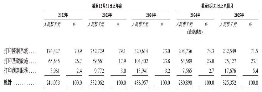 打印控制系统是主力,2025年前8个月贡献2.33亿元,占总收入71.5%