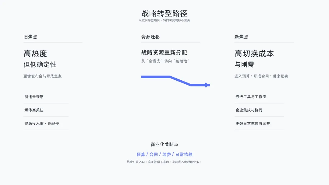 更值得注意的是:AI 公司内部的资源,正在从“最会制造未来感的项目”转向“最能进入预算、合同、续费与日常依赖的主业务”。