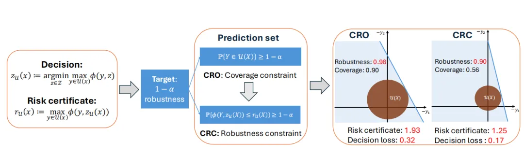 上图说明论文动机:同样是名义上 的目标,传统 CRO 因为盯住覆盖率,最后达到的是更高的实际鲁棒性,于是付出了更大的风险代价;CRC 则把鲁棒性控制在目标附近,因此决策更有效率。