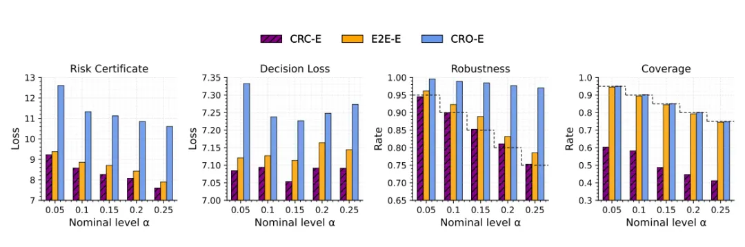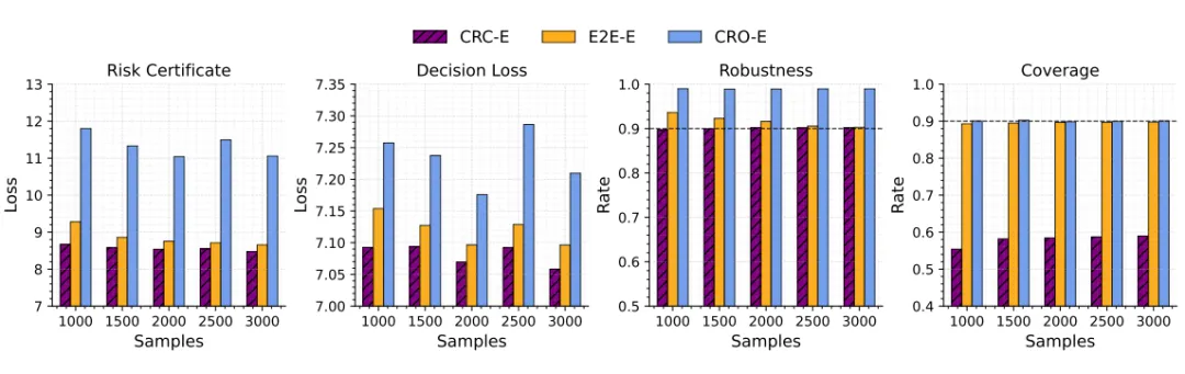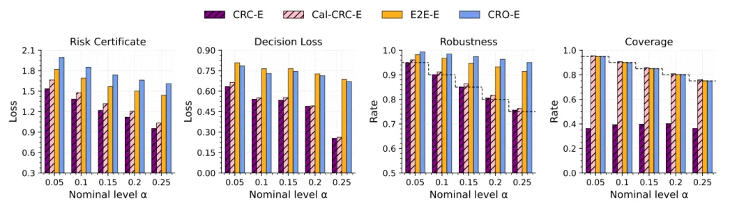 结论是:CRC 的风险与决策损失都更低,鲁棒性贴近目标值,而覆盖率明显低于鲁棒性目标。这一点很关键,因为它表明“较低覆盖率但足够鲁棒”在决策问题里是完全可能的,也正是本文方法的出发点。