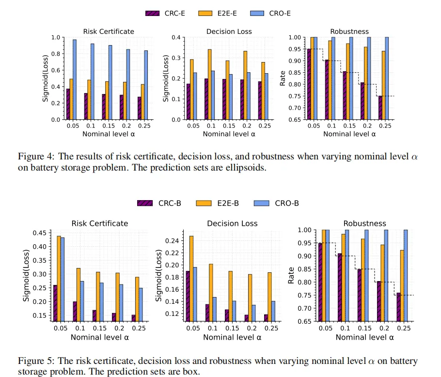 图中无论采用椭球集还是盒形集,CRC 都保持了更低的风险和决策损失,同时鲁棒性更接近名义目标。也就是说,本文方法并不局限于线性投资任务,在带动态约束的优化中也有类似表现。