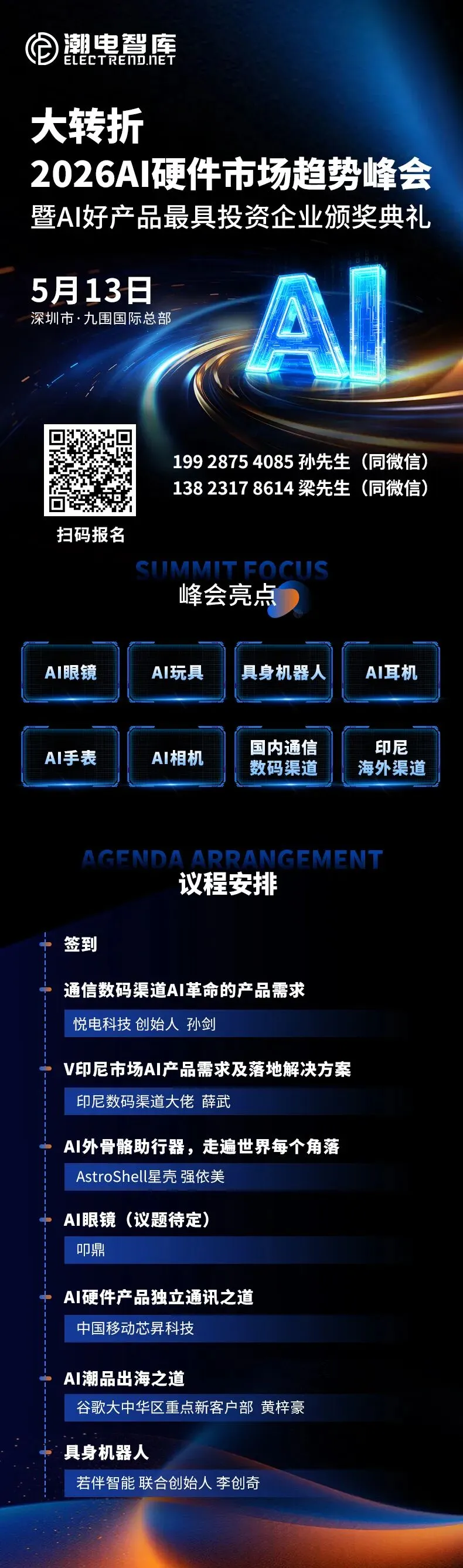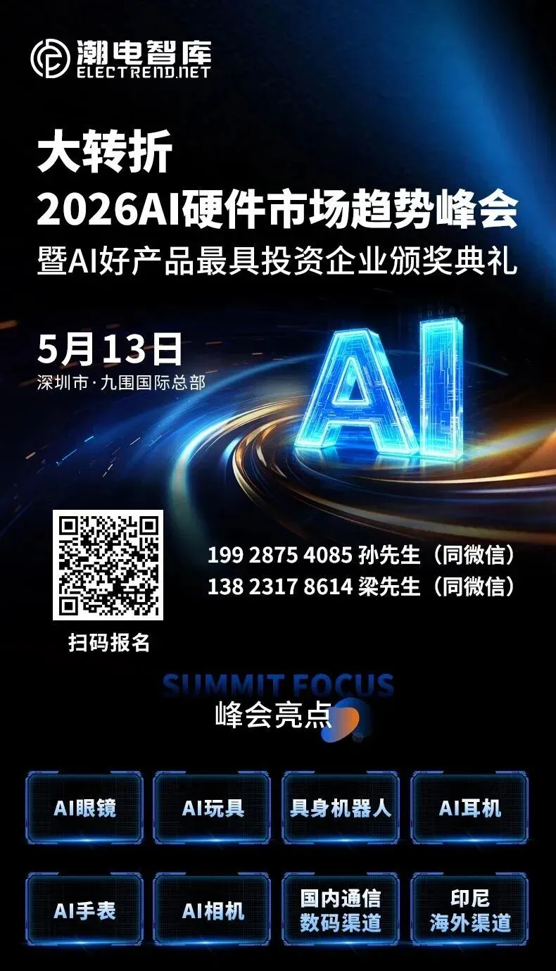 5月13日,潮电智库将顺势举办“2026 AI硬件市场趋势峰会暨AI好产品最具投资企业颁奖典礼”。除了上述六大领域的活跃企业玩家与资本机构,还有国内通信数码渠道、印尼海外渠道现场为产品落地护航。
