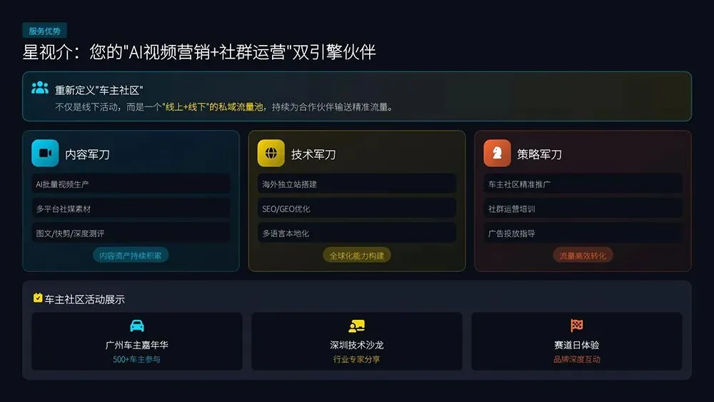 2026年,汽车改装行业的破局之路,是告别内卷、用品牌与创新构筑护城河。星视介以AI视频营销+车主社区双引擎,助力企业深耕国内存量市场、开拓海外增量蓝海,让中国改装品牌闪耀全球!