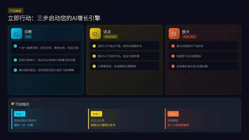 演讲最后,巫云锋分享三步落地行动方案:免费一对一品牌诊断、低成本试点验证、规模化全域放大,帮助企业快速启动AI 增长引擎。