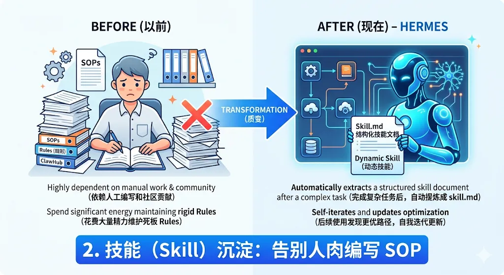 skill.md)。下次遇到类似任务,它直接加载该技能,抄近道解决。更绝的是,它在后续使用中如果发现了更优的路径,还会自我迭代更新这份文档,彻底省去了人工维护的成本。