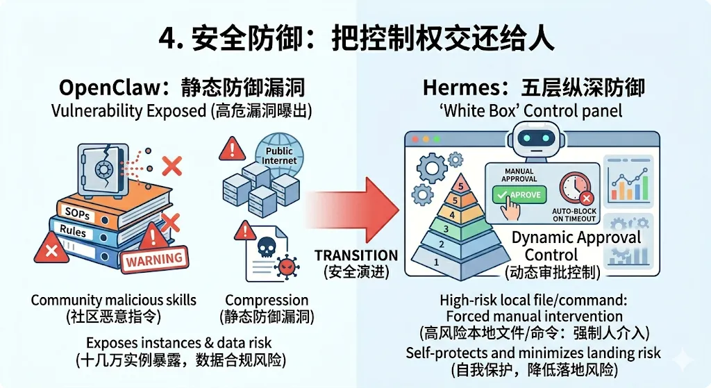 今年 2 月份,OpenClaw 被爆出过高危漏洞,十几万个实例直接暴露在公网上,技能市场里也混入了恶意指令。这让很多有数据合规要求、对接企业级客户的团队惊出一身冷汗。 相比于 OpenClaw 偏向“事后审计”的信任模型,Hermes 在产品设计上采用了五层纵深防御。最直观的体验就是它的“白盒化”机制——对于执行终端命令、修改本地文件等高风险操作,默认强制需要人工介入审批,超时不批就自动拦截。这种安全底座,在实际落地时阻力会小非常多。