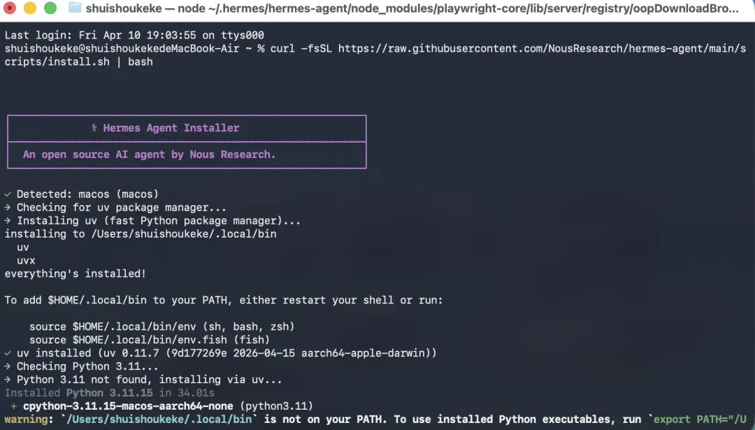 curl -fsSL https://raw.githubusercontent.com/NousResearch/hermes-agent/main/scripts/install.sh | bash按下回车后,你可以去摸会鱼。 这行脚本在后台会自动替你完成 脏活累活,它会依次检测并安装运行 Hermes 必备的底层依赖: