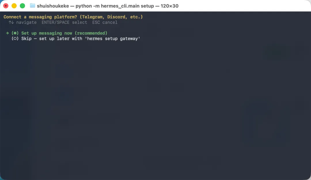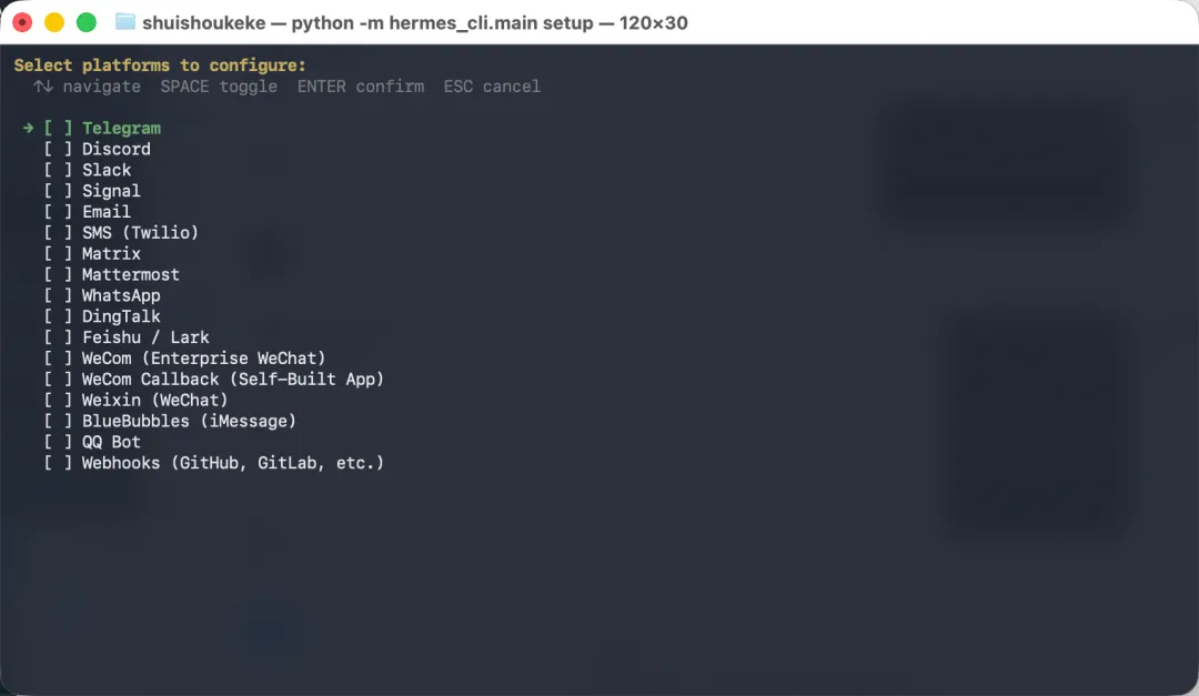 模型设置完成后,配置向导会自动引导你进入消息通道设置(这与 OpenClaw 的配置顺序一致)。这是为了决定你平时要在哪个平台上与 Hermes Agent 聊天。