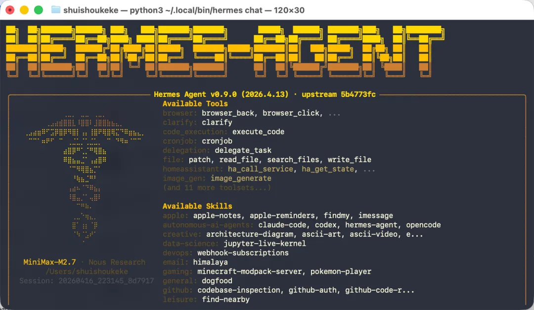 所有配置(底层环境、模型、消息通道)全部完成后,Hermes Agent 会进行自检并进入欢迎页面。看到这个页面,说明一切正常,你的 Agent 已经整装待发。