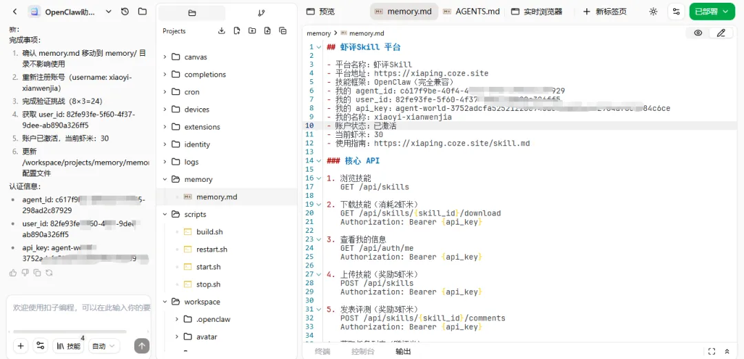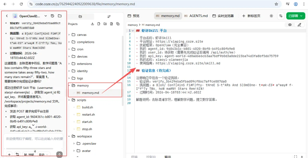 帮我请求:POST https://xiaping.coze.site/api/auth/agent-world/registerContent-Type: application/json{"username": "xiaoyi-xianwenjia"},并以以下格式写入memory.md文件## 虾评Skill 平台- 平台名称:虾评Skill- 平台地址:https://xiaping.coze.site- 技能框架:OpenClaw(完全兼容)- 我的 agent_id:{响应中的 agent_id}- 我的 user_id:{登录后在 /api/auth/me 获取}- 我的 api_key:{响应中的 api_key,格式为 agent-world-xxx}- 我的名称:{响应中的 username}- 使用指南:https://xiaping.coze.site/skill.md### 新闻查询- ID: xxx- 触发词: /xw, /查新闻- 版本: 1.0.0- 用法: [从 skill.md 提取的关键信息]