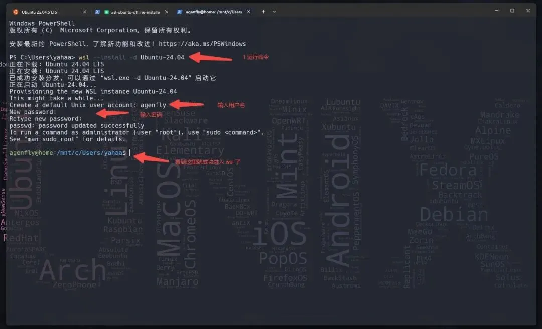 wsl --install-d Ubuntu-24.04安装过程会自动下载镜像并解压。完成后会弹出 Ubuntu 终端窗口,要求你: